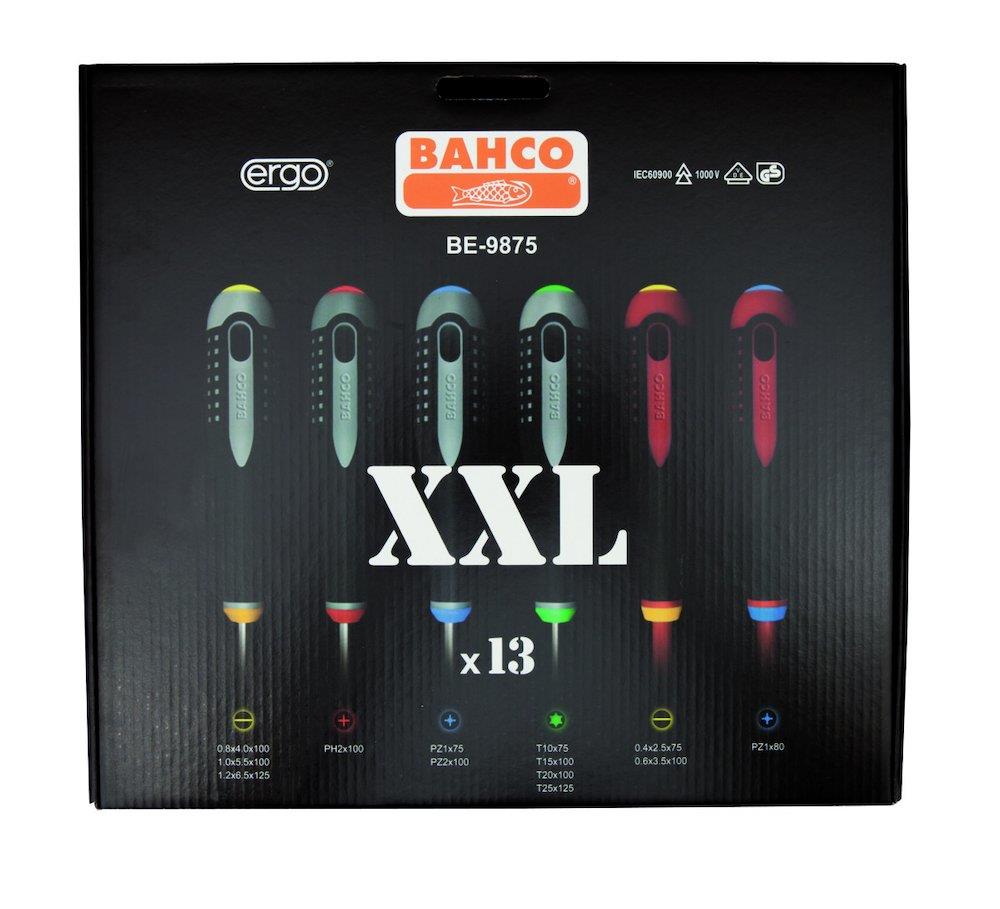 Bahco XXL ergonomisk skruetrækkersæt med 13 dele for Phillips-, Pozidriv-, ligekærv- og Torx®-skruer. Indeholder 3 ligekærv, 2 ligekærv (1000V), 1 Phillips, 2 Pozidriv, 1 Pozidriv (1000V) og 4 Torx®.
